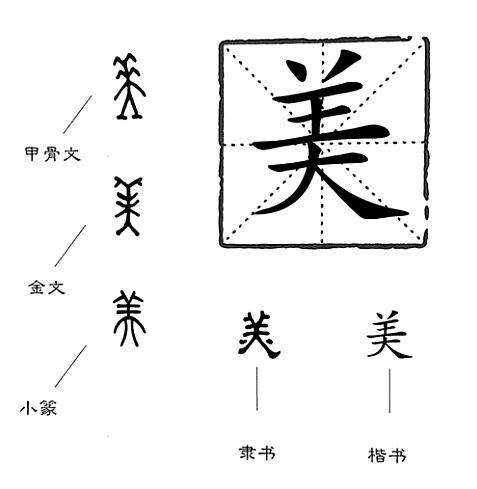 但是,從字源上看,“美”似乎不是一只羊,而是一個(gè)人。“美”初見于商代甲骨文,在甲骨文中,“美”不是會(huì)意字,而是象形字,它的古字形像一個(gè)戴著頭飾站得端端正正的人。一個(gè)人若頭上裝飾著高聳彎曲的羽毛或類似的頭飾物,是不是很美呢?本來(lái)遠(yuǎn)古時(shí)的先民喜歡在頭上插上橫七豎八的頭飾,再聯(lián)想一下印第安酋長(zhǎng)頭上那頂裝飾著長(zhǎng)長(zhǎng)羽毛的發(fā)冠,“美”的甲骨文字形簡(jiǎn)直就是印第安酋長(zhǎng)的簡(jiǎn)筆畫。