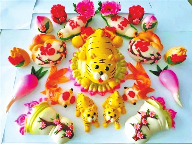 紅艷艷的牡丹花、形象各異的小動物……王霞制作的花饃不再是普通的食材,而是栩栩如生的藝術(shù)品。放在展臺最中間的一個巨型花饃格外吸睛。這個花饃用一層層面餅做底座,每一層面餅上都有牡丹、月季、百合等各種花卉競相開放,不時有蝴蝶和小鳥停留在花朵上,充滿著喜意。