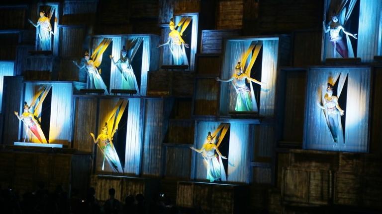 活化敦煌古樂器、古樂譜研發(fā)成果的《樂動敦煌》,采用全息投影、3D威亞等高科技手段,以全沉浸式的呈現(xiàn)方式,演繹了西域少年白氏追尋藝術(shù)的動人故事,劇中運用了來自敦煌壁畫中復原的五弦琵琶、排簫、蓮花阮等16件古樂器,演繹了胡旋舞、腰鼓舞、琵琶舞等多種敦煌舞蹈,還原了敦煌壁畫中的樂舞盛景。