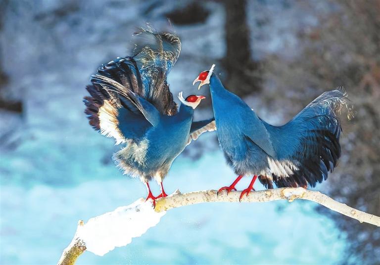 藍(lán)馬雞是珍稀名貴的禽類,頭側(cè)緋紅,耳羽簇白色、突出于頸部頂上,通體藍(lán)灰色,中央尾羽特長而翹起,尾羽披散下垂如馬尾,故名藍(lán)馬雞。冬日里,藍(lán)馬雞成群飛落山腳覓食,藍(lán)羽丹頂行走在雪地上格外搶眼。數(shù)量繁多的藍(lán)馬雞是祁連山野生山地雞的“顏值擔(dān)當(dāng)”。覓食時(shí),藍(lán)馬雞常用爪刨挖林中空地苔蘚和林緣草地,尋找掉落的云杉種子。刨食的過程會(huì)讓土壤松動(dòng),便于種子生根發(fā)芽,促進(jìn)林區(qū)植物天然更新。