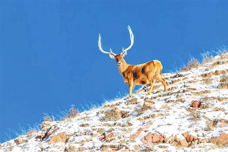 雪豹皮毛呈灰白色,有黑色點(diǎn)斑和黑環(huán),在巖石堆中是極好的保護(hù)色。雪豹行蹤神秘,以往人們只有通過雪地上的梅花掌印確定它的足跡。近年來,隨著祁連山生態(tài)環(huán)境的持續(xù)好轉(zhuǎn),保護(hù)區(qū)已經(jīng)成為雪豹、白唇鹿等珍稀動(dòng)物繁衍生息的樂土。作為高原生態(tài)食物鏈頂端的食肉動(dòng)物,雪豹對維持祁連山生態(tài)系統(tǒng)的穩(wěn)定與健康至關(guān)重要。