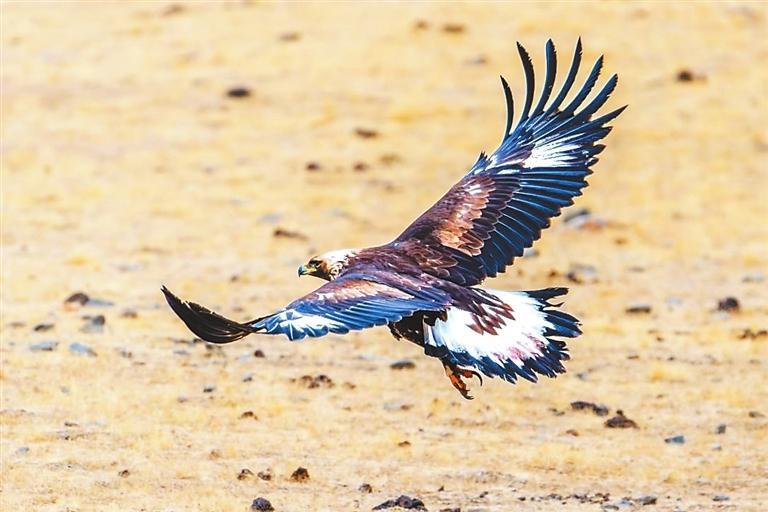 金雕以其卓越的捕獵技巧和優(yōu)雅的飛行姿態(tài)而聞名,主要棲息于高山草原、森林及河谷地帶。在祁連山遼闊的草原之上,金雕展開它那寬闊且有力的雙翅,在藍(lán)天之中肆意翱翔。陽光傾灑下來,深褐色的羽毛閃爍著如同金屬般耀眼的光澤,猶如披上了一件堅(jiān)不可摧的鎧甲,威風(fēng)凜凜。它那犀利的眼神,仿佛能夠穿透重重迷霧,洞察這片廣袤土地上的每一個(gè)細(xì)微變化,盡顯王者風(fēng)范。它身姿雄偉而威嚴(yán),宛如一位至高無上的王者,向整個(gè)世界展示著它那不容小覷的力量與威嚴(yán),默默地守護(hù)著這片廣袤無垠的草原天地。