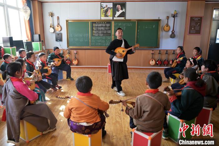 2月26日,甘肅省甘南藏族自治州瑪曲縣寄宿制藏族小學(xué)龍頭琴?gòu)棾鐖F(tuán)活動(dòng),加措正在教孩子們彈唱。九美旦增 攝