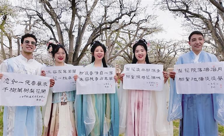 在接下來(lái)的詩(shī)詞互動(dòng)環(huán)節(jié),外籍留學(xué)生開(kāi)啟換裝模式,身著漢服,徜徉在梨花樹(shù)下,吟誦著“梨花”主題的詩(shī)句,感受中國(guó)漢服之美和中國(guó)傳統(tǒng)文化的魅力。換裝后的外籍留學(xué)生也讓梨園秒變“出片現(xiàn)場(chǎng)”。“這是我第一次穿漢服,穿著漢服在梨園里拍的照片真的很好看。”來(lái)自越南的黃青草,迫不及待地想把這份梨園的浪漫春日記憶分享給自己的同學(xué)、朋友。