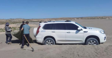 車子終于在陷入沙地3小時后脫離困境??疾靾F(tuán)在羊井子鄉(xiāng)用過午餐后返回酒泉。