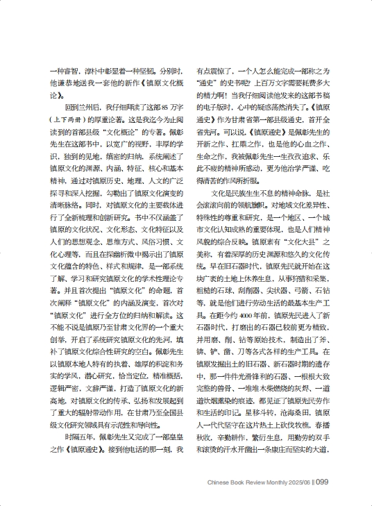 回到蘭州后,我仔細(xì)拜讀了這部85萬字(上下兩冊)的厚重論著。這是我迄今為止閱讀到的首部縣級“文化概論”的專著。佩彰先生在這部書中,以寬廣的視野,豐厚的學(xué)識,獨到的見地,縝密的歸納,系統(tǒng)闡述了鎮(zhèn)原文化的淵源、內(nèi)涵、特征、核心和基本精神,通過對鎮(zhèn)原歷史、地理、人文的廣泛探尋和深入挖掘,勾勒出了鎮(zhèn)原文化演變的清晰脈絡(luò)。同時,對鎮(zhèn)原文化的主要載體進(jìn)行了全新梳理和創(chuàng)新研究。書中不僅涵蓋了鎮(zhèn)原的文化狀況、文化形態(tài)、文化特征以及人們的思想觀念、思維方式、風(fēng)俗習(xí)慣、文化心理等,而且在探幽析微中揭示出了鎮(zhèn)原文化蘊(yùn)含的特色、樣式和規(guī)律,是一部系統(tǒng)了解、學(xué)習(xí)和研究鎮(zhèn)原文化的學(xué)術(shù)性理論專著。并且首次提出“鎮(zhèn)原文化”的命題,首次闡釋“鎮(zhèn)原文化”的內(nèi)涵及演變,首次對“鎮(zhèn)原文化”進(jìn)行全方位的歸納和解讀。這不能不說是鎮(zhèn)原乃至甘肅文化界的一個重大創(chuàng)舉,開啟了系統(tǒng)研究鎮(zhèn)原文化的先河,填補(bǔ)了鎮(zhèn)原文化綜合性研究的空白。佩彰先生以鎮(zhèn)原本地人特有的執(zhí)著、雄厚的積淀和務(wù)實的學(xué)風(fēng),潛心研究,恰當(dāng)定位,精準(zhǔn)概括,邏輯嚴(yán)密,文辭嚴(yán)謹(jǐn),打造了鎮(zhèn)原文化的新高地,對鎮(zhèn)原文化的傳承、弘揚和發(fā)展起到了重大的輻射帶動作用,在甘肅乃至全國縣級文化研究領(lǐng)域具有示范性和導(dǎo)向性。