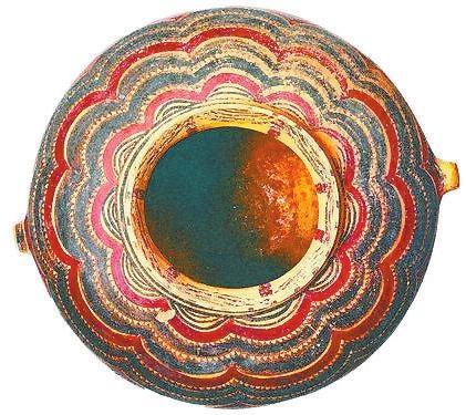 其中以馬家窯文化彩陶為代表,蘊含著眾多神秘的社會文化信息,以線條作為造型手段、以黑色(墨色)作為主要基調,奠定了中國畫發(fā)展的歷史基礎與以線描為特征的基本形式。馬家窯文化彩陶也是中國音樂舞蹈的開端呈現。1973年,甘青地區(qū)大通縣出土的馬家窯文化彩陶舞蹈紋盆,內壁繪舞蹈人物3組,每組5人,令人感受到遠古舞蹈強烈的節(jié)奏感。1991年,甘肅武威市發(fā)現的彩陶舞蹈紋盆,內壁繪有兩組手拉手的舞蹈人物,每組9人,舞蹈人數更多。1995年,宗日遺址再次出土一件馬家窯文化彩繪舞蹈紋盆,內壁所繪舞蹈人物兩組,分別為11人和13人,給人一種優(yōu)雅的舞蹈意境。1986年,甘肅省永登縣出土馬家窯文化的彩陶鼓。這些珍貴的彩陶器物成為研究中國原始歌舞和音樂起源的佐證。