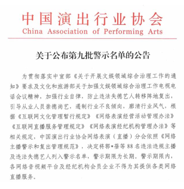 中國(guó)演出行業(yè)協(xié)會(huì)網(wǎng)絡(luò)表演(直播)分會(huì)近日發(fā)布了第九批網(wǎng)絡(luò)主播警示名單,包括“鐵山靠”“郭老師”兩名職業(yè)主播和“吳亦凡”“鄭爽”“張哲瀚”三名演員在內(nèi)的88名主播將在行業(yè)內(nèi)被實(shí)行聯(lián)合抵制和懲戒。這是違法失德藝人首次被納入網(wǎng)絡(luò)主播警示名單中,防止劣跡藝人轉(zhuǎn)移陣地復(fù)出。
