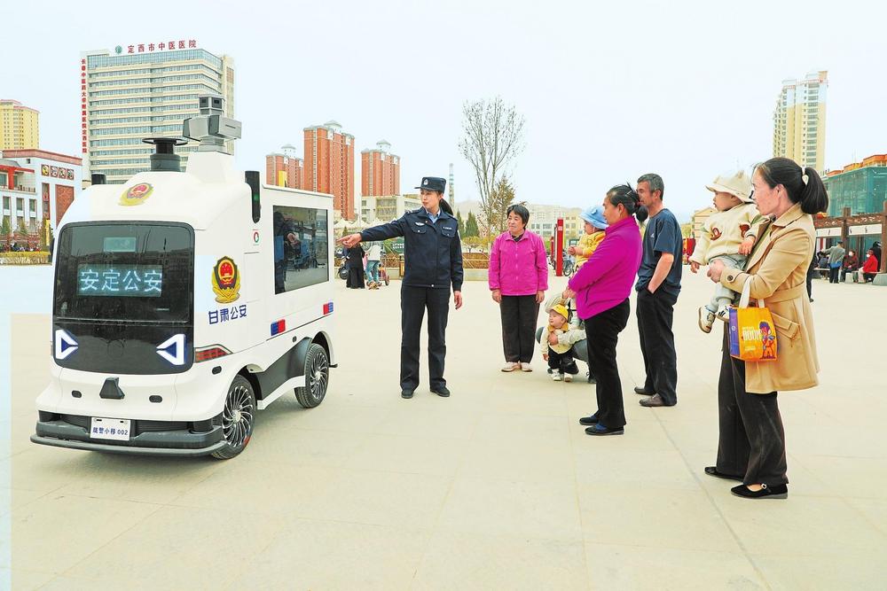 群眾參觀公安智能巡邏車。近日,定西市安定區(qū)許鐵堂廣場上出現(xiàn)一款引人注目的科技產(chǎn)品——智能巡邏車,這是安定公安在現(xiàn)代化警務(wù)建設(shè)中引入的智慧產(chǎn)品,能夠24小時不間斷工作,引發(fā)群眾關(guān)注。 新甘肅·甘肅法治報(bào)通訊員楊永剛攝