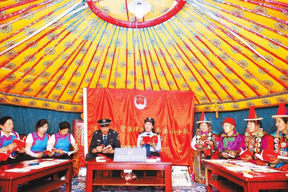“西出陽關(guān)無故人,而今法治伴我行。”在肅北蒙古族自治縣,黨河峽谷的風(fēng)裹挾著悠揚(yáng)的馬頭琴聲,將“法治烏蘭牧騎”的歌聲傳向遠(yuǎn)方;