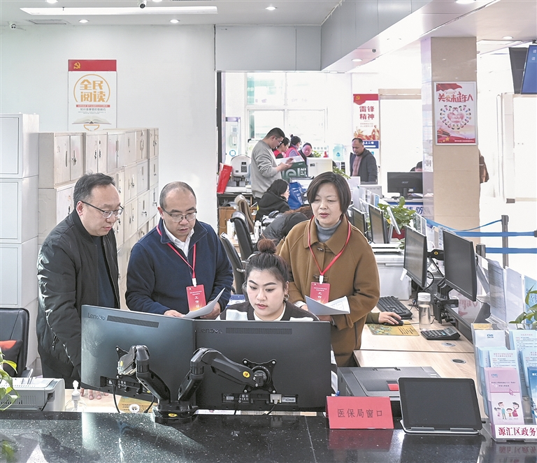 河南省漯河市源匯區(qū)紀(jì)委監(jiān)委聚焦醫(yī)?;鸢踩\(yùn)行等關(guān)鍵環(huán)節(jié)開展專項(xiàng)整治,督促主管部門著力整治醫(yī)?;鸸芾碇刑搱?bào)冒領(lǐng)、騙取套取等違紀(jì)違法行為,嚴(yán)肅查處監(jiān)管失職失責(zé)及背后的不正之風(fēng)和腐敗問題。圖為近日,該區(qū)紀(jì)委監(jiān)委工作人員到區(qū)行政服務(wù)中心醫(yī)保局窗口走訪核實(shí)相關(guān)情況。尤亞輝 攝
