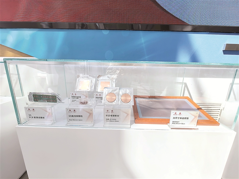 在懷柔科學(xué)城的核心區(qū)域,坐落著占地面積12.6畝的輕元素量子材料交叉平臺。走進大廳,玻璃展示柜中擺放著銅基石墨烯復(fù)合線、大尺寸單晶銅箔、6N高純銅顆粒等一系列尖端材料。其中,一款圓形透明的12英寸單層二硫化鉬薄膜格外引人注目,平臺工作人員王異楠告訴記者,這是現(xiàn)有技術(shù)下能做出的直徑最大的單層二硫化鉬薄膜,主要應(yīng)用在激光器領(lǐng)域。
