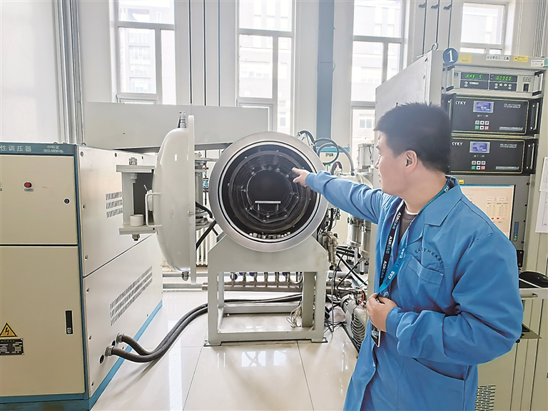 中國科學(xué)院空天信息創(chuàng)新研究院行波管工藝技術(shù)負責(zé)人劉泳良介紹高溫真空釬焊爐的用途。左翰嫡 攝