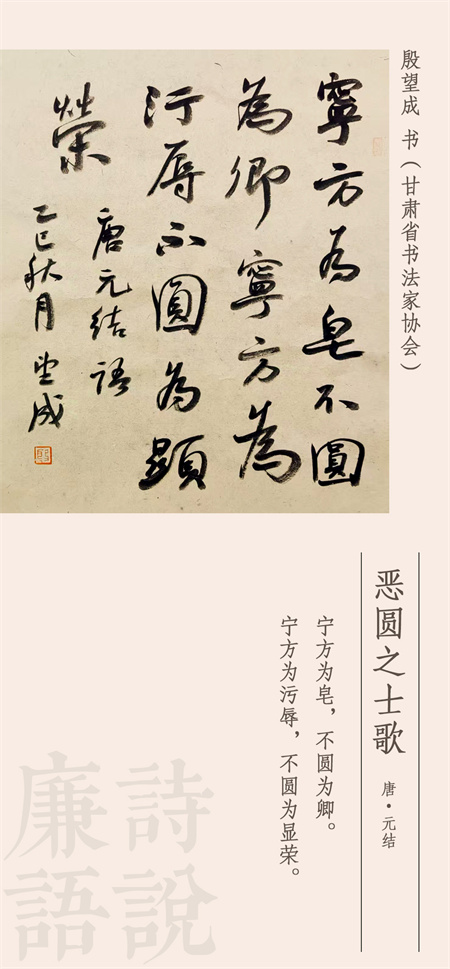這首詩出自他的一篇寓言體短文《惡圓》,意思是厭惡圓滑。詩句語氣堅(jiān)定、態(tài)度鮮明,有點(diǎn)斬釘截鐵的意味。他說,寧可處世方正而淪為皂吏,也不愿處世圓滑而升為公卿。寧可處世方正而受盡屈辱,也不愿處世圓滑而顯耀榮華。短短四句十八個(gè)字,就刻畫出一個(gè)倔強(qiáng)、傲岸的君子形象。元結(jié)這里提到的方與圓,直指官場(chǎng)習(xí)氣。做官就應(yīng)該行事方正,講原則、有底線,應(yīng)該實(shí)事求是、擔(dān)當(dāng)實(shí)干;不應(yīng)該行事圓滑,應(yīng)該不作秀、不唯上、不虛浮,不茍且。正因他有這樣特立獨(dú)行的操守,才能在極端艱難的境況下做出非凡的政績(jī)。