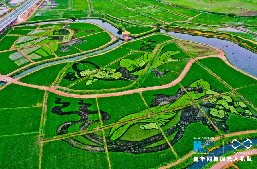 13日清晨,一場小雨過后,朝陽照射在甘肅省張掖市甘州區(qū)烏江鎮(zhèn)新河田園綜合體稻田景觀區(qū)內(nèi),2000多畝稻田中一幅幅稻田畫栩栩如生,從高處俯瞰,田園風(fēng)光和生態(tài)美景展現(xiàn)在人們眼前。