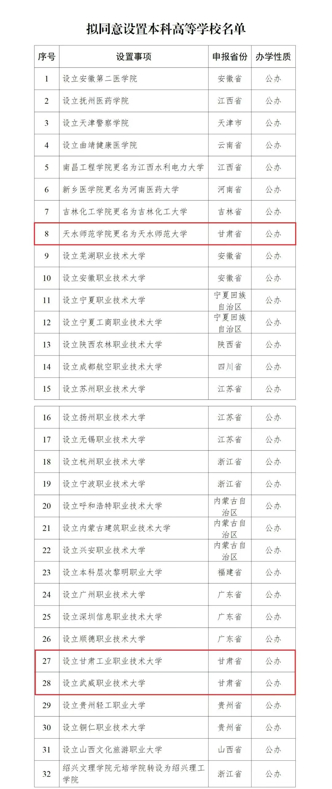 32所學(xué)校中,我省天水師范學(xué)院更名為天水師范大學(xué),新設(shè)立甘肅工業(yè)職業(yè)技術(shù)大學(xué)與武威職業(yè)技術(shù)大學(xué),三所大學(xué)均為公辦學(xué)校。