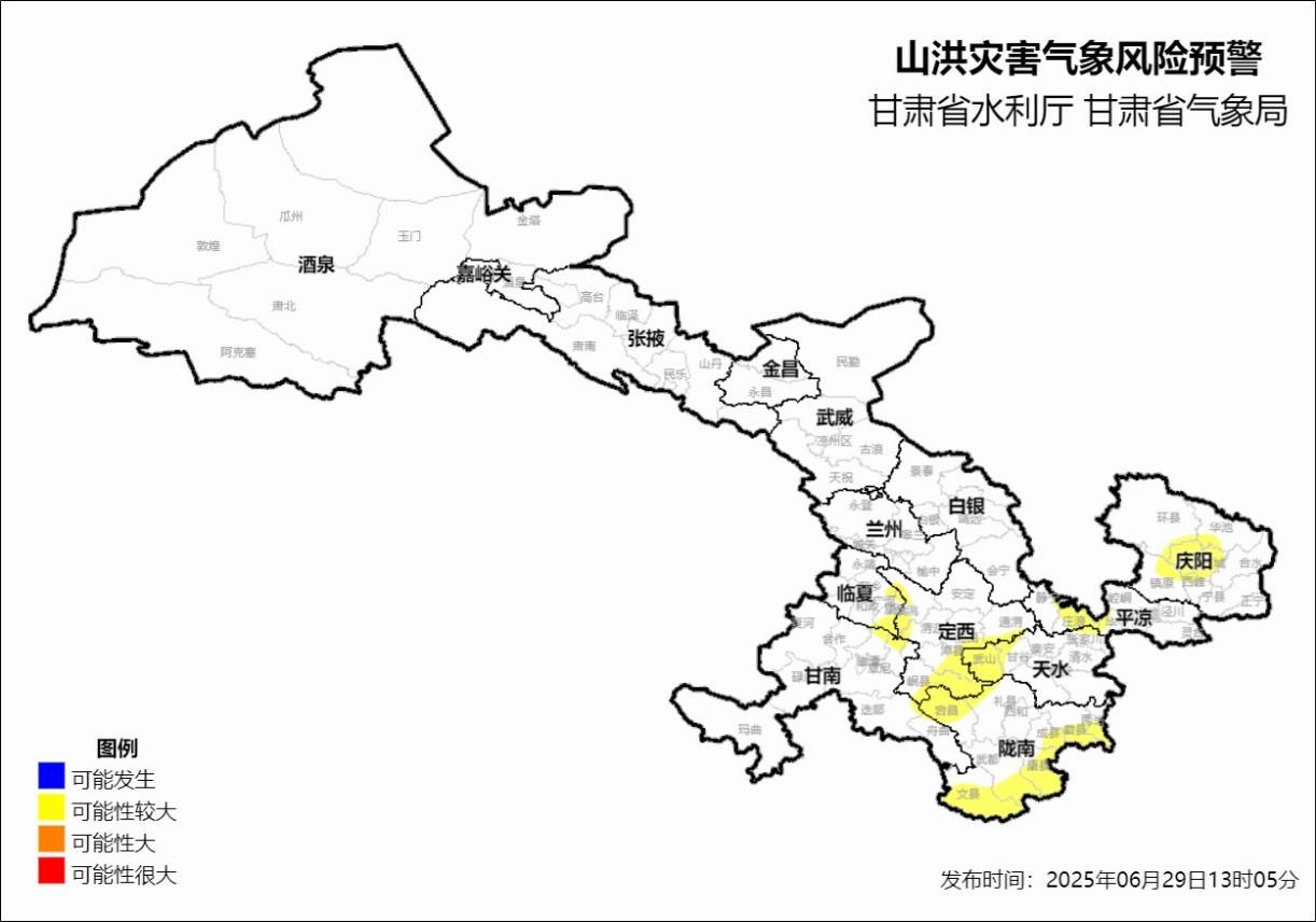 根據(jù)省氣象局《重大氣象信息專報》(2025年甘氣第10期),未來十天甘肅省多降水天氣,具有對流性強、小時雨強大、累積雨量大等特點,洪水災(zāi)害風(fēng)險高。6月29日13時,省水利廳、省氣象局聯(lián)合發(fā)布山洪災(zāi)害氣象風(fēng)險預(yù)警:預(yù)計,6月29日14時至30日14時,白銀市(景泰縣),武威市(古浪縣),定西市(臨洮縣、渭源縣、通渭縣、隴西縣、漳縣、岷縣),臨夏州(廣河縣、東鄉(xiāng)縣、康樂縣),甘南州(臨潭縣、卓尼縣、舟曲縣、迭部縣),天水市(秦安縣、甘谷縣、武山縣、張家川縣),隴南市(宕縣、禮縣、武都區(qū)、成縣、文縣、康縣、徽縣、兩當(dāng)縣),平?jīng)鍪校o寧縣、崆峒區(qū)、華亭市、莊浪縣),慶陽市(西峰區(qū)、慶城縣、環(huán)縣、華池縣、鎮(zhèn)原縣)等地區(qū)發(fā)生山洪災(zāi)害可能性較大(黃色預(yù)警)。