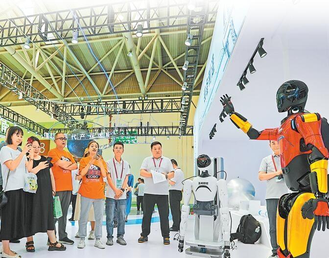 蘭州館內(nèi),參觀者與機(jī)器人展開(kāi)互動(dòng)。本組圖片攝影:新甘肅·甘肅日?qǐng)?bào)記者 田蹊