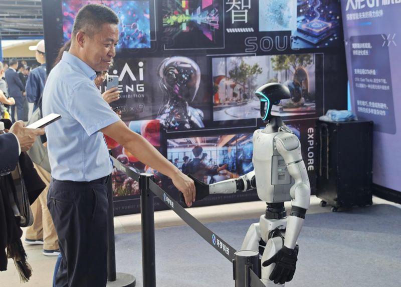 圖為參觀者與機器人互動