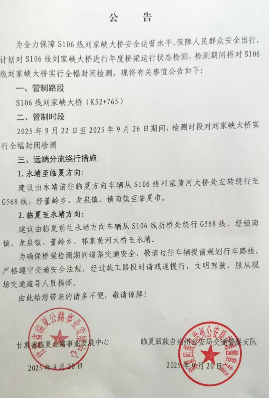 中國甘肅網(wǎng)9月20日訊(西北角·中國甘肅網(wǎng)記者 宋芳科 )記者從臨夏州公路事業(yè)發(fā)展中心獲悉,為全力保障S106線劉家峽大橋安全運(yùn)營水平,保障人民群眾安全出行,臨夏州公路事業(yè)發(fā)展中心計(jì)劃對(duì)S106線劉家峽大橋進(jìn)行年度橋梁運(yùn)行狀態(tài)檢測,2025年9月22日至2025年9月26日期間,將對(duì)S106線劉家峽大橋?qū)嵭腥忾]檢測。