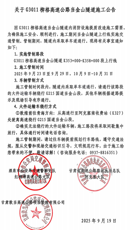 中國甘肅網(wǎng)9月22日訊(西北角·中國甘肅網(wǎng)記者 宋芳科)記者從敦當(dāng)高速公路項目部門獲悉,因G3011柳格高速當(dāng)金山隧道內(nèi)消防設(shè)施提質(zhì)改造施工需要,為確保施工安全、順利進行,2025年9月23日至9月29日,10月9日至10月31日,兩個時間段,G3011柳格高速當(dāng)金山隧道K353+000-K358+000段上行線將實施管制。國慶期間停止施工,保障通行。