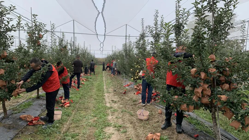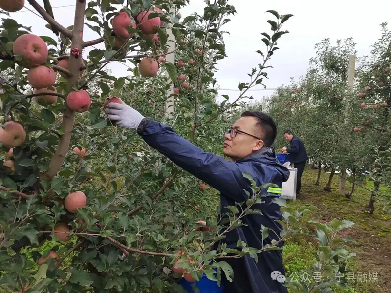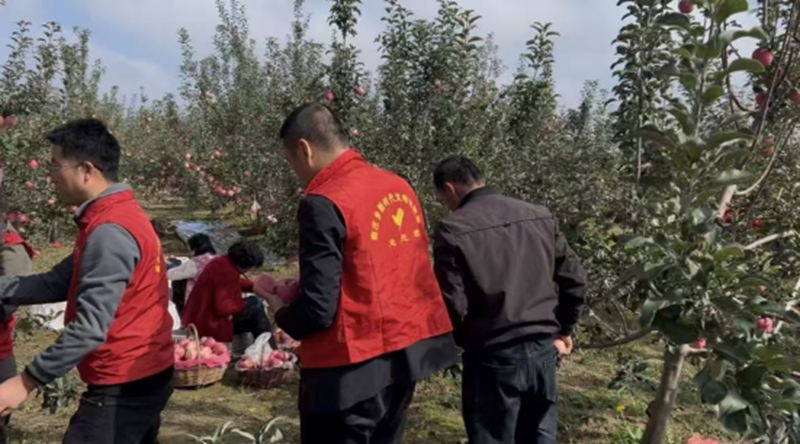 在果農(nóng)岳世德家的果園里,平日里伏案工作的干部職工們,此刻化身“采摘工”,忙碌的身影在果樹(shù)間穿梭,鮮艷的紅馬甲與紅蘋果互相映襯。