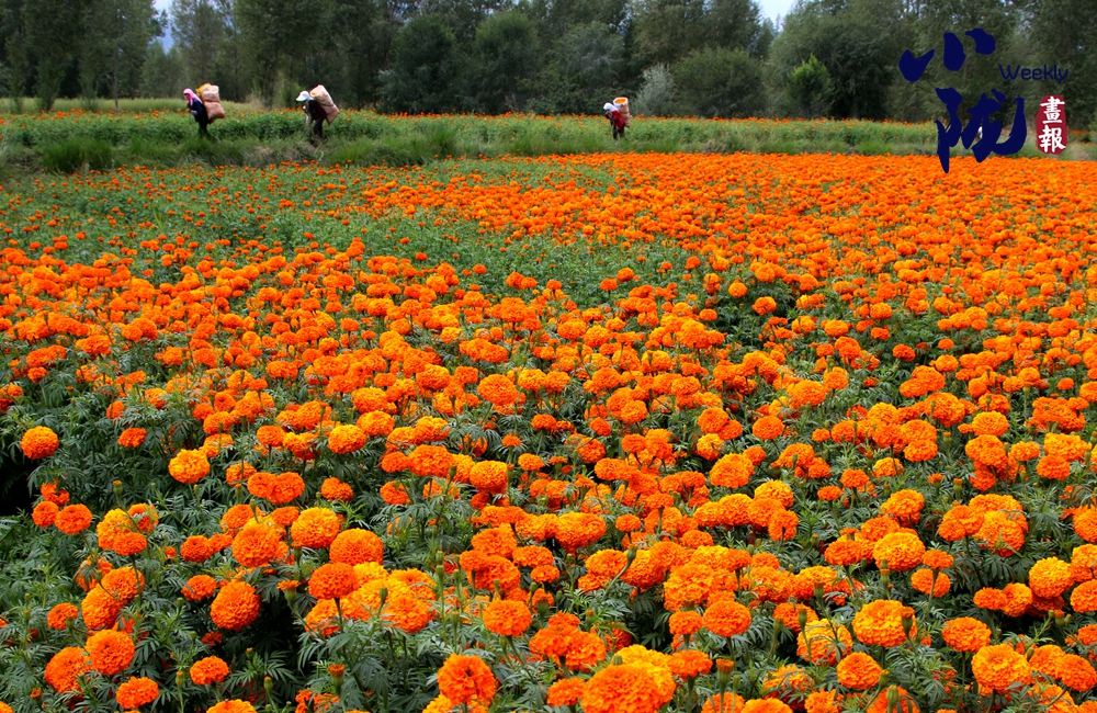 金黃的萬壽菊低垂著頭,仿佛是在向大地母親致謝,感謝她給予的滋養(yǎng)與庇護。農(nóng)人們穿梭其間,臉上洋溢著滿足與幸福的笑容,他們的汗水在這一刻得到了豐厚的回報。