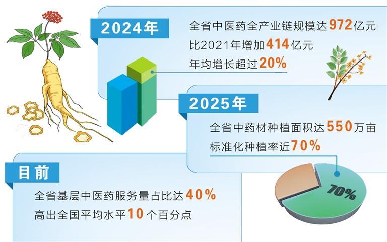 如今,全省已建立起覆蓋省、市、縣、鄉(xiāng)的中醫(yī)藥服務(wù)體系,實(shí)現(xiàn)所有綜合醫(yī)院中醫(yī)藥服務(wù)全覆蓋,基層醫(yī)療衛(wèi)生機(jī)構(gòu)中醫(yī)館全覆蓋,中醫(yī)適宜技術(shù)推廣使用全覆蓋,基層中醫(yī)藥服務(wù)量占比達(dá)40%,高出全國平均水平10個(gè)百分點(diǎn),真正做到讓人民群眾“方便看中醫(yī)、放心吃中藥”。