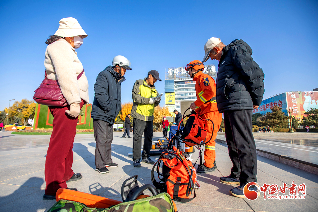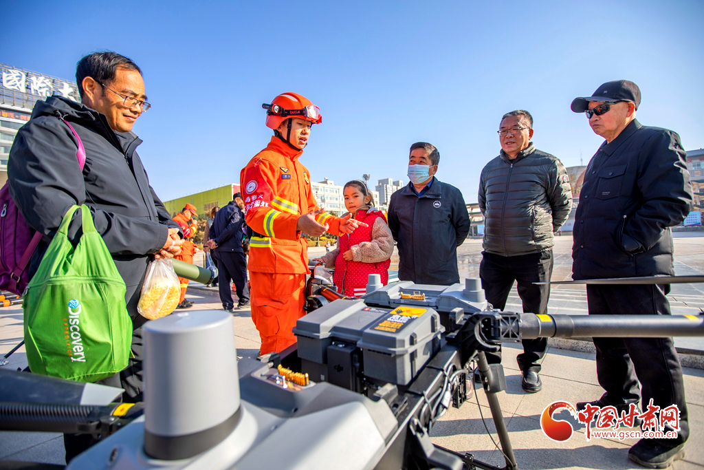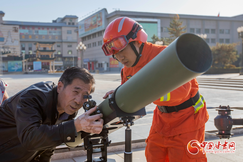 消防隊(duì)員給裕固族群眾講解地震救援裝備液壓擴(kuò)張器在救援中的用途