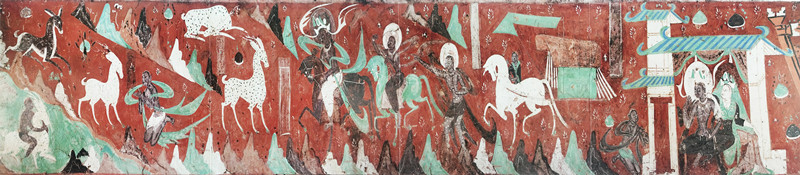 這幅壁畫在藝術(shù)風(fēng)格上獨樹一幟,深受中原繪畫形式的影響。它既摒棄了印度壁畫的環(huán)形構(gòu)圖方式,又不同于龜茲壁畫里的菱形畫面布局,而是開創(chuàng)性地采用了連環(huán)畫式的長卷式構(gòu)圖,宛如一條歷史的長河,將故事娓娓道來。