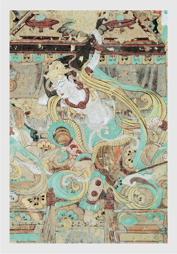 畫面中的人物造型嚴(yán)格遵循唐代仕女的畫風(fēng)繪制,顯得豐腴飽滿,恰似盛唐時(shí)期雍容華貴的氣質(zhì)寫照。線描寫實(shí)明快,流暢飛動(dòng),一氣呵成,仿佛是畫師用靈動(dòng)的筆觸在墻壁上勾勒出的生命樂章。畫面的顏色以石綠、赭黃、鉛白為主色。整個(gè)畫面顯得典雅、嫵媚,令人賞心悅目。雖然伎樂天頭部原本貼金的頭飾已經(jīng)剝落,但歲月的痕跡并未減損她雍容華貴的氣質(zhì),反而更增添了一份歷史的厚重感。