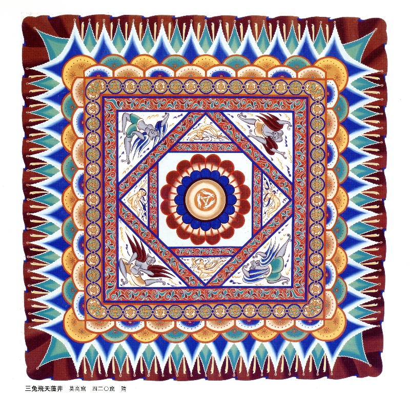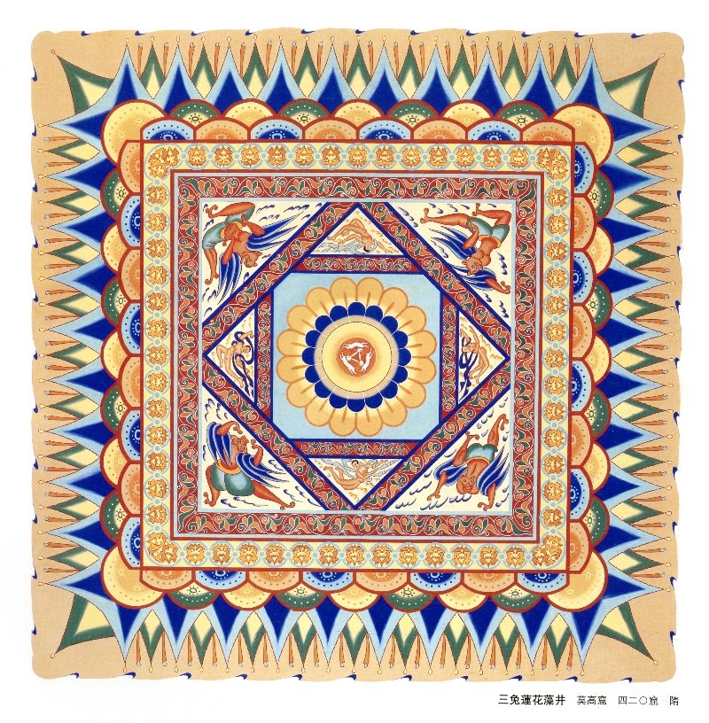 三兔共耳圖案、成熟的飛天造型、精美的紋飾圖案相互映襯,共同構(gòu)成了這幅令人嘆為觀止的藻井壁畫,受到人們的廣泛關(guān)注和喜愛。