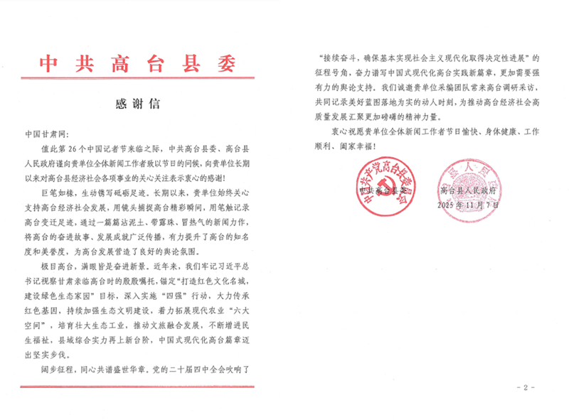 中國記者節(jié)|高臺(tái)縣委縣政府致信中國甘肅網(wǎng) 向全體新聞工作者致以節(jié)日問候