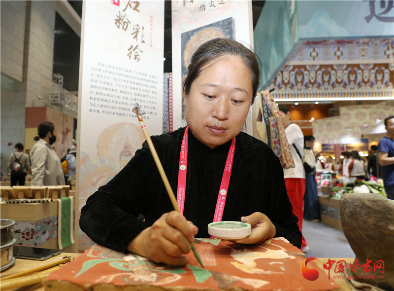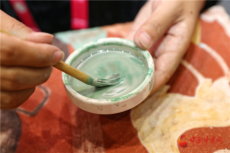 與敦煌石粉彩繪技藝的相遇,像一場跨越時(shí)空的約定。那天,她看見老師傅蹲在黨河岸邊,將彩色石頭細(xì)細(xì)研磨,青金石化作澄澈的藍(lán),朱砂揉成熾熱的紅,礦石粉末與膠液相融后,在泥板上暈開的光澤,竟與莫高窟壁畫的溫潤如出一轍。“這不是簡單的畫畫,是在和千年前的畫工對(duì)話。”她當(dāng)即拜師,從此成了黨河邊最執(zhí)著的“尋石人”——一遍遍彎腰撿拾彩石,在研磨聲里探尋壁畫“千年不褪色”的奧秘:黨河沉淀的澄板土做底,摻上細(xì)沙與棉絮拌勻,再敷上親手制的礦石顏料,每一步都藏著對(duì)古法的敬畏,每一筆都浸著對(duì)文明的珍視。有時(shí)對(duì)著壁畫臨摹,恍惚間竟覺指尖觸到了千年前的顏料,耳畔似有畫工的低語,那份時(shí)空交錯(cuò)的共鳴,讓她更堅(jiān)定了守護(hù)這份技藝的決心。