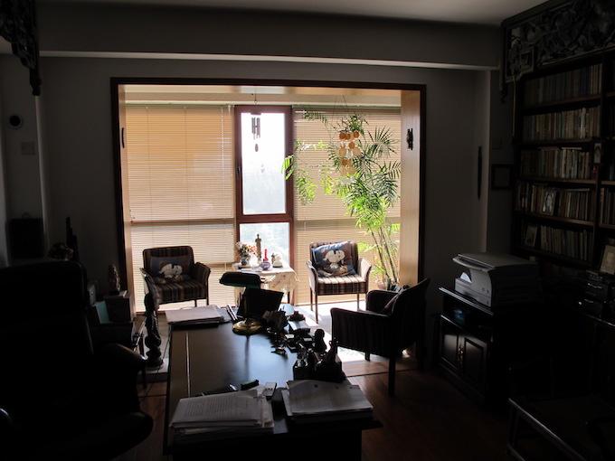 書(shū)桌上擺著臺(tái)燈、筆筒,以及他喜歡的各類(lèi)藝術(shù)品。氣晴好時(shí),逆向照進(jìn)來(lái)的陽(yáng)光會(huì)把這一切都變成“剪影”,很美。