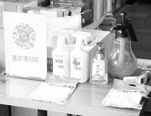 中原圖書大廈服務(wù)臺為讀者準(zhǔn)備的掃碼處和防疫消毒用品。