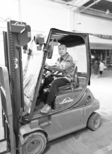 馬曉峰駕駛叉車搬運(yùn)圖書(shū)。