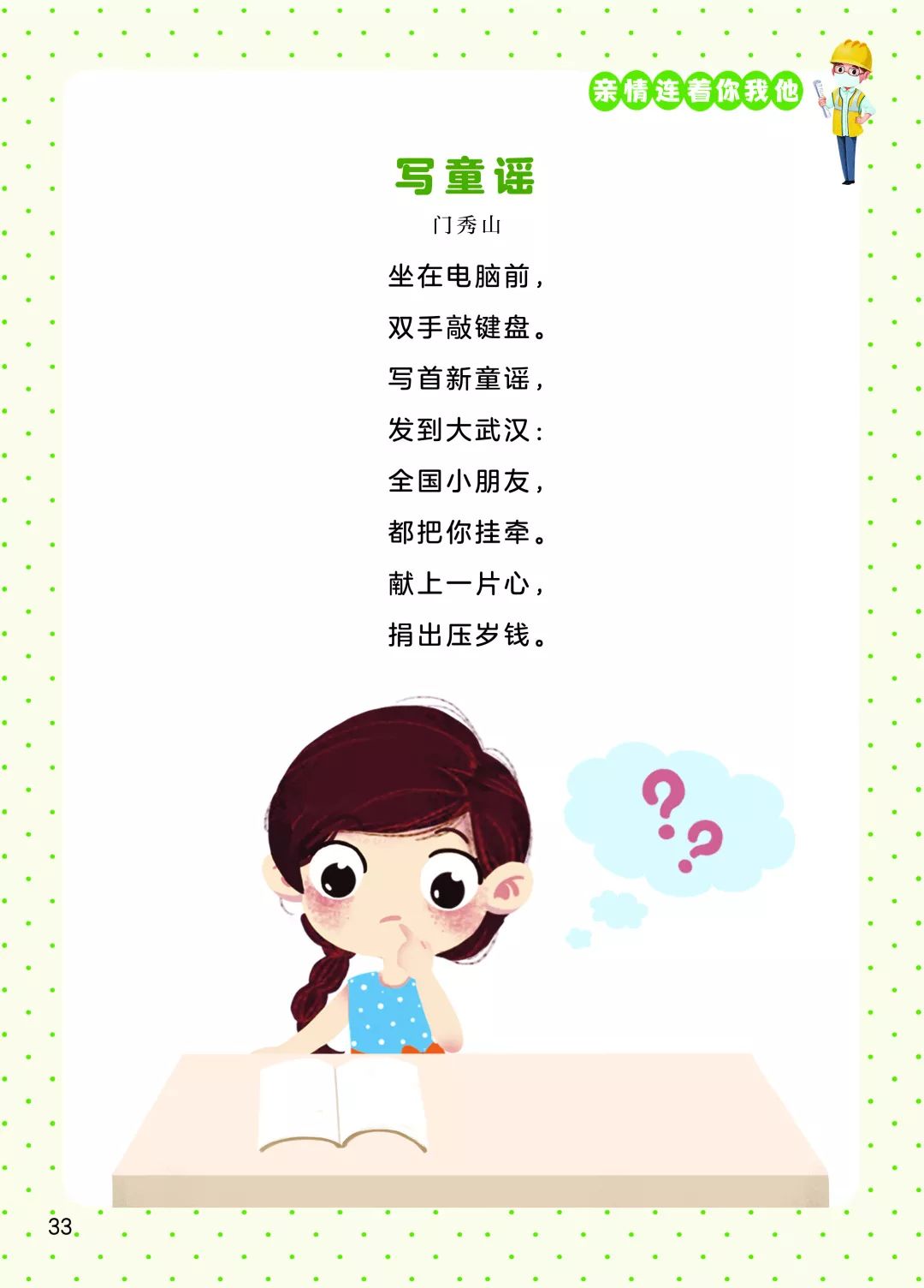 新冠肺炎疫情爆發(fā)以來,全國人民積極投入到疫情防控阻擊戰(zhàn)中,孩子們、兒童文學(xué)作家也紛紛發(fā)聲,創(chuàng)作了大量優(yōu)秀的童謠。每一首童謠是一聲鼓勁的吶喊,匯集起來就是嘹亮的戰(zhàn)歌;每一首童謠點(diǎn)亮一束希望的光,光束匯聚就是光明的未來。