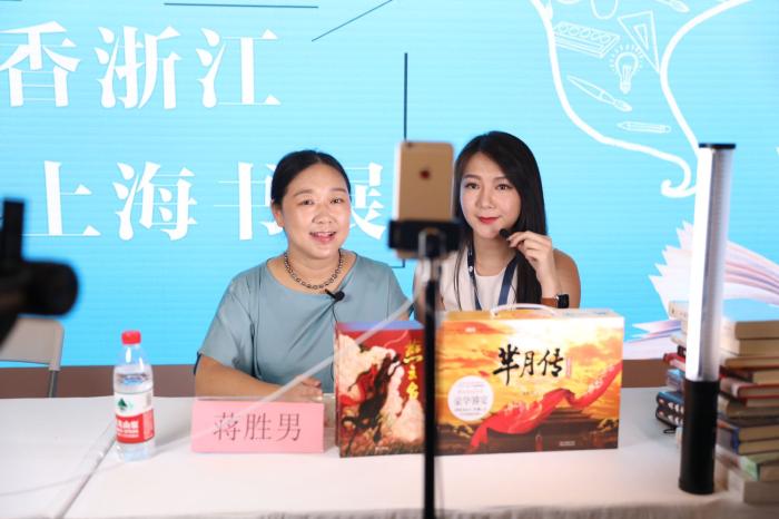 作家蔣勝男在上海書展與網(wǎng)絡(luò)達(dá)人直播中。浙江文藝出版社供圖