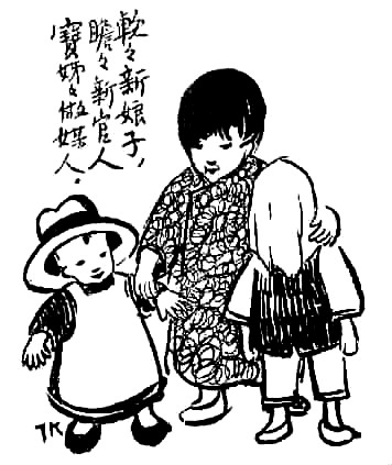 子愷先生藝術(shù)之獨(dú)特在另一方面——獨(dú)樹高標(biāo),表現(xiàn)童心童趣,抒情融入詼諧,展示了一種美學(xué)境界。此類經(jīng)典之作大多收集于《兒童相》。令人過目不忘者如畫孩子持兩蒲扇,一前一后,作騎馬狀,題曰“瞻瞻的腳踏車”;孩子將自己的鞋子墊于四腳圓凳之下,題曰“阿寶兩只腳,凳子四只腳”。于兒童經(jīng)驗(yàn)之局限寫其心靈之天真,于不起眼的、平常人視之無所謂的現(xiàn)象中發(fā)現(xiàn)童心之美。還有一幅令人印象深刻,三個(gè)孩子,一女稍高,立于中,左側(cè)男孩,戴英式禮帽,甚大,右側(cè)女孩,頭蒙面布,題曰“軟軟新娘子,瞻瞻新官人,寶姊姊做媒人”。其事極不現(xiàn)實(shí)而孩子極慎重,于兒童顯示童心童趣,于畫則表現(xiàn)了先生的愛心和幽默。