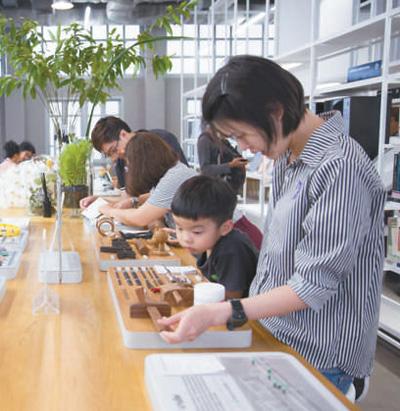 在泰國創(chuàng)意與設計中心圖書館,來訪者正在位于二層的材料體驗區(qū)參觀。泰國創(chuàng)意與設計中心圖書館供圖
