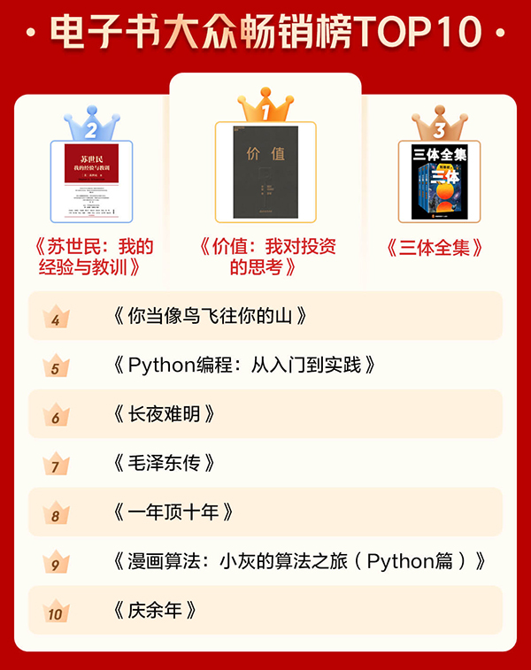 通過電子書暢銷榜TOP10和有聲暢銷榜TOP10可以看出,很多人愈發(fā)關(guān)注投資和管理等方面的內(nèi)容,也愈發(fā)注重個人學(xué)習(xí)?!秲r值:我對投資的思考》《蘇世民:我的經(jīng)驗與教訓(xùn)》 分別位居電子書暢銷榜第一名和第二名。《中國經(jīng)濟(jì)2020》《原則》進(jìn)入有聲暢銷榜前十。此外,學(xué)習(xí)類圖書《Python編程:從入門到實踐》《漫畫算法:小灰的算法之旅(Python篇)》也上榜電子書暢銷榜前十。
