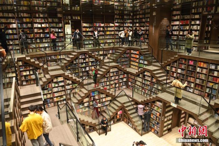 資料圖:重慶九龍坡區(qū)商圈內(nèi),一書店因設(shè)計(jì)感非常獨(dú)特,吸引了不少民眾前來打卡玩耍。陳超 攝