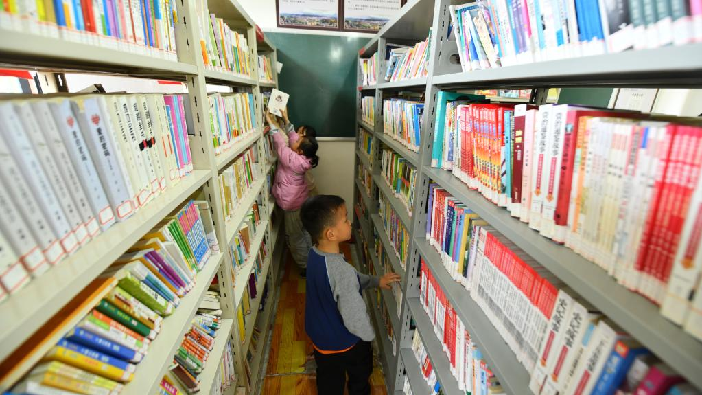 骨龍村小學學生在圖書室閱讀(5月25日攝)。