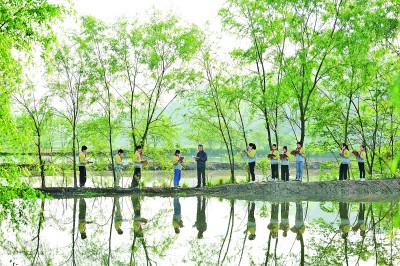 在江西萬載縣馬步鄉(xiāng)洞口村,老師和學生們在柳樹下閱讀。鄧龍華攝/光明圖片