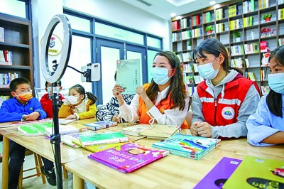在江蘇如皋市如城街道顧莊社區(qū)農家書屋內,志愿者通過網絡平臺為學生推薦好書。徐慧攝/光明圖片