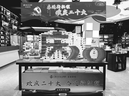 廣西新華書店集團(tuán)股份有限公司組織全區(qū)各連鎖門店先后開展了“喜迎二十大 助力新發(fā)展”主題圖書展示展銷、“歡慶二十大 奮進(jìn)新征程”主題系列活動。廣西新華書店集團(tuán)股份有限公司相關(guān)負(fù)責(zé)人介紹,全區(qū)門店近期開展“歡慶二十大 奮進(jìn)新征程”主題門店美陳大賽,通過精選出111個全國近期出版的主題圖書品種進(jìn)行重點展示,配套主題海報、背景板,以各門店融合當(dāng)?shù)靥厣拇a堆造型進(jìn)行整體美陳,向廣大讀者推薦一批導(dǎo)向正確、質(zhì)量上乘的優(yōu)秀主題圖書。