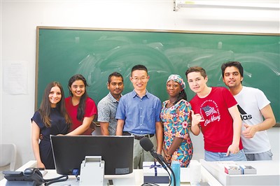 洪桐懷(左四)在北京語言大學的教室中和來華留學生合影。