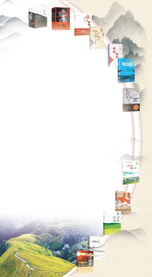 書影圖片從上至下依次為《人世間》《主角》《海邊春秋》《十八洞村的十八個(gè)故事》《國(guó)家溫度》《琵琶圍》《遠(yuǎn)去的白馬》《江山如此多嬌》《靠山》《新山鄉(xiāng)巨變》《西海固筆記》《重卡雄風(fēng)》(按出版時(shí)間排序)。何向陽 供圖;底圖為廣西龍勝各族自治縣龍脊梯田景色。韋吉陽 攝(人民視覺)