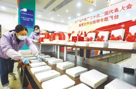 連日來,江蘇省連云港市東海縣新華書店精心設(shè)置了黨的二十大重要文件出版物專題展臺,集中展示展銷黨的二十大文件及學(xué)習(xí)輔導(dǎo)讀物,同時增設(shè)閱讀區(qū),市民可以隨時閱讀黨的二十大報告單行本、《黨的二十大報告輔導(dǎo)讀本》、《中國共產(chǎn)黨章程》單行本等圖書,吸引了眾多黨員、學(xué)生、市民和機(jī)關(guān)企事業(yè)單位人員等不同群體的讀者前來閱讀選購。